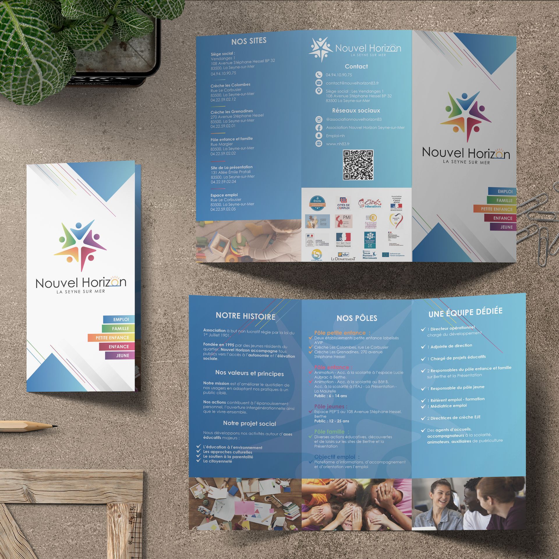 De la création a l’impression Pubkom a réalisé là plaquette commerciale de Nouvel Horizon. L'association Nouvel Horizon, située à La Seyne-sur-Mer, œuvre pour le soutien social et l'accompagnement des personnes en difficulté. Elle propose diverses actions d'entraide, d'insertion sociale et de solidarité pour améliorer la qualité de vie de ses bénéficiaires.