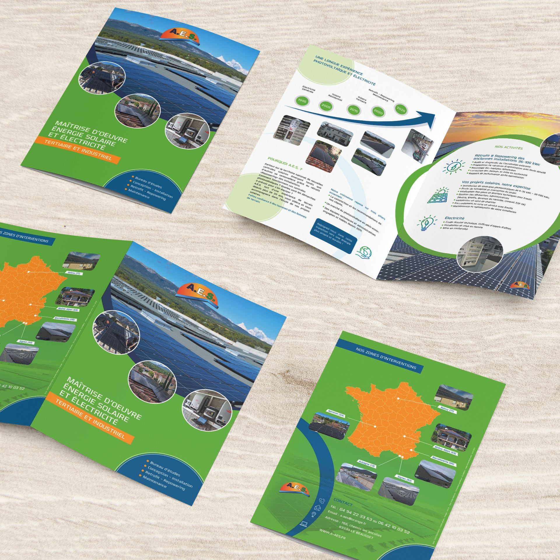 Implantée dans le Parc d’activités de Signes, l’entreprise AES a fait appel à Pubkom pour l’ impression de ses dépliants deux volets . Grâce à notre proximité géographique et à notre parc machines d’impression numérique , nous avons pu répondre à la demande du client en assurant une production en quelques heures. Cette plaquette commerciale permet à AES (Applications Électriques Solaires), spécialiste exclusif du photovoltaïque depuis plus de 20 ans, de présenter l’ensemble de ses services. Elle vise à accompagner ses clients, particuliers comme professionnels, dans la réalisation de leurs projets solaires. Site internet → https://a-aes.fr/