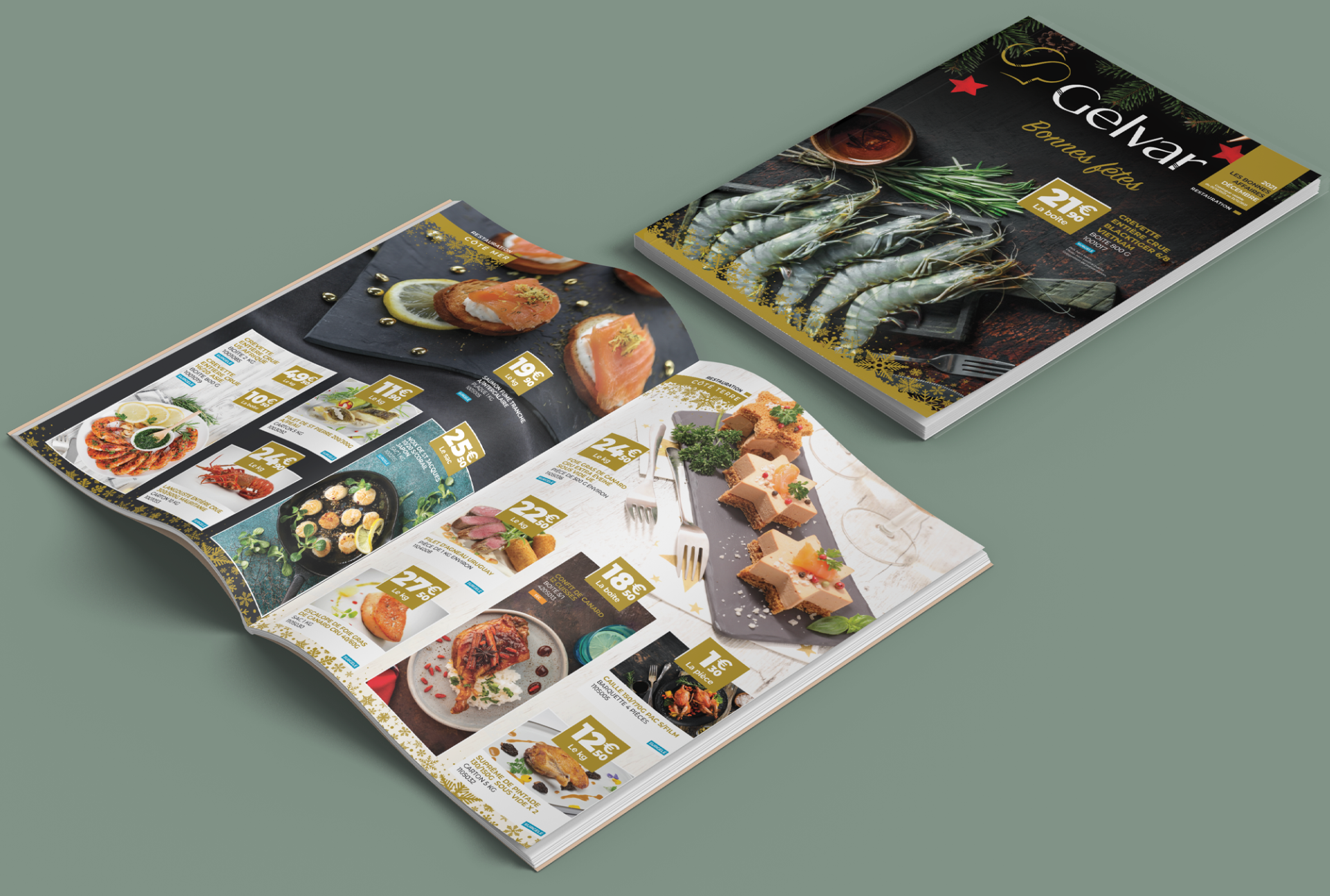 De la maquette à l'impression, Pubkom a réalisé le catalogue des promotions de décembre pour Gelvar, le grossiste alimentaire (surgelés, frais, épicerie et droguerie) pour les professionnels de la restauration, les boulangeries et pâtisseries.