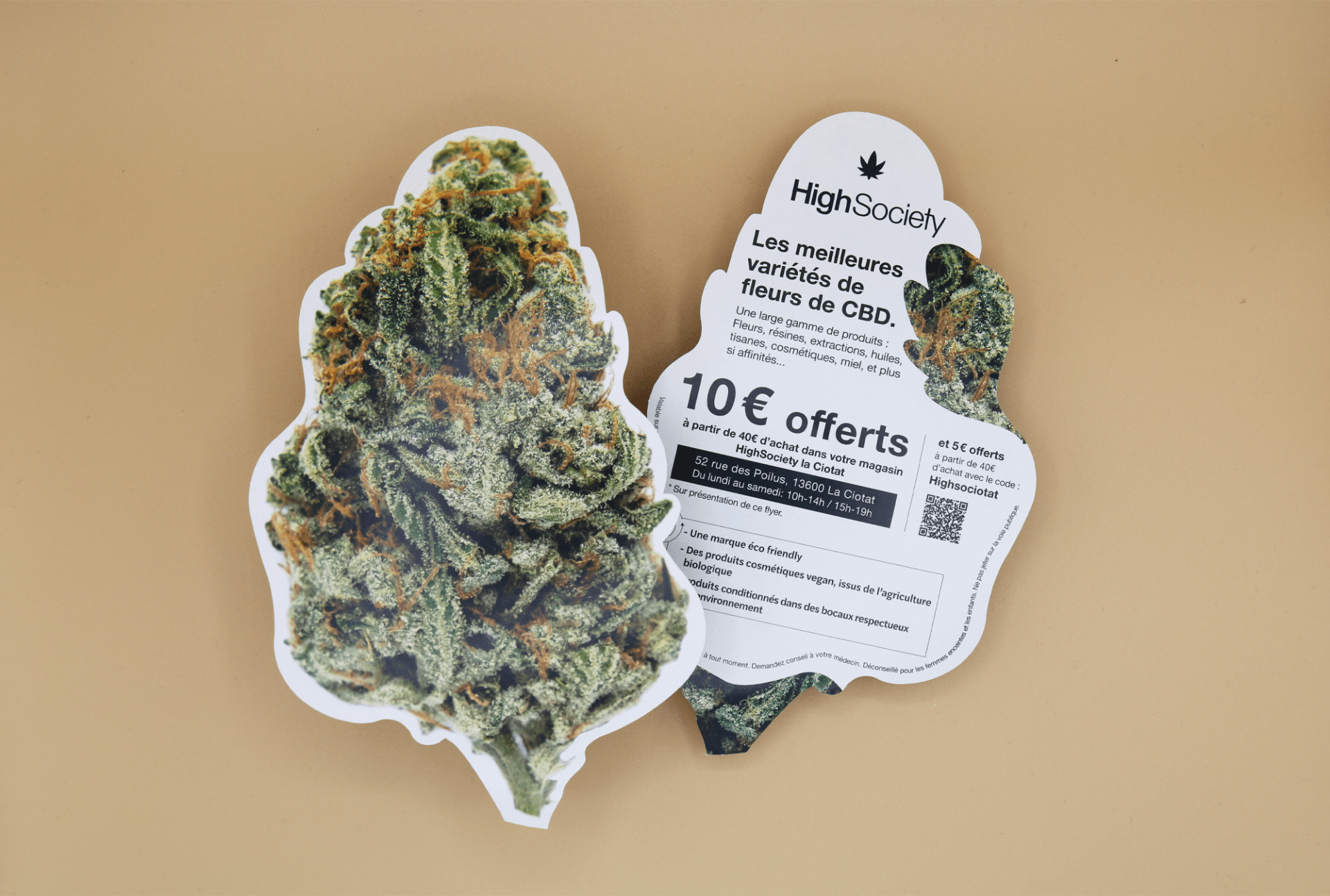 High Society a fait de nouveau confiance à Pubkom pour l'impression de flyers avec une découpe à la forme personnalisée pour une opération publicitaire en boîtes aux lettres. High Society est une marque qui propose divers types de produits à base de CBD.