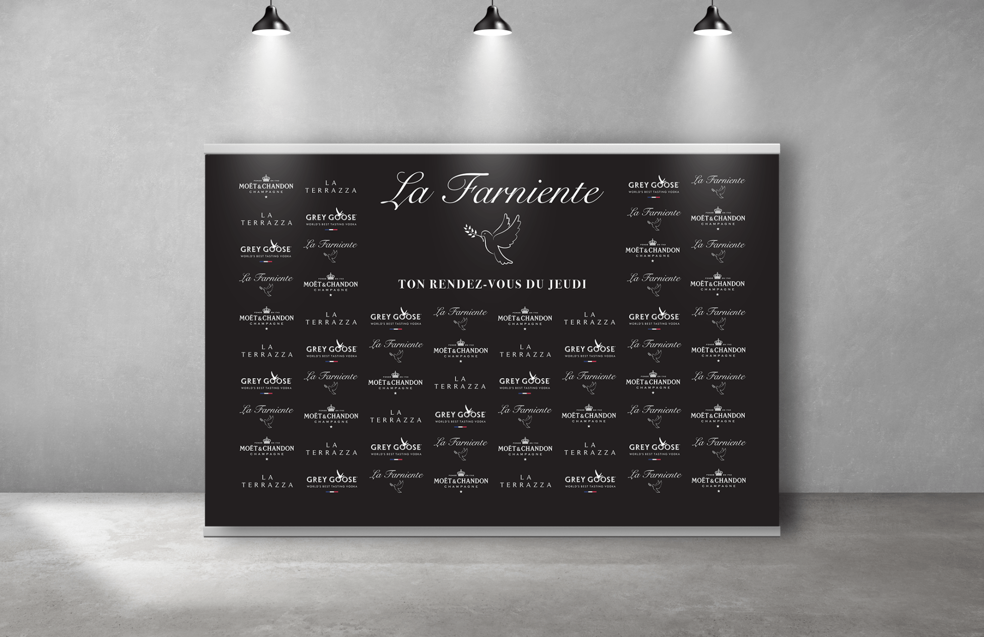 La Farniente a fait confiance à Pubkom pour la réalisation d'un photocall. La Farniente organise des soirées tous les jeudis au restaurant La Terrazza situé à Six-Fours-les-Plages. Imprimé sur une bâche en PVC grand format, le photocall est un support de communication événementielle qui permet d’inviter le public à se faire photographier devant un décor personnalisé.