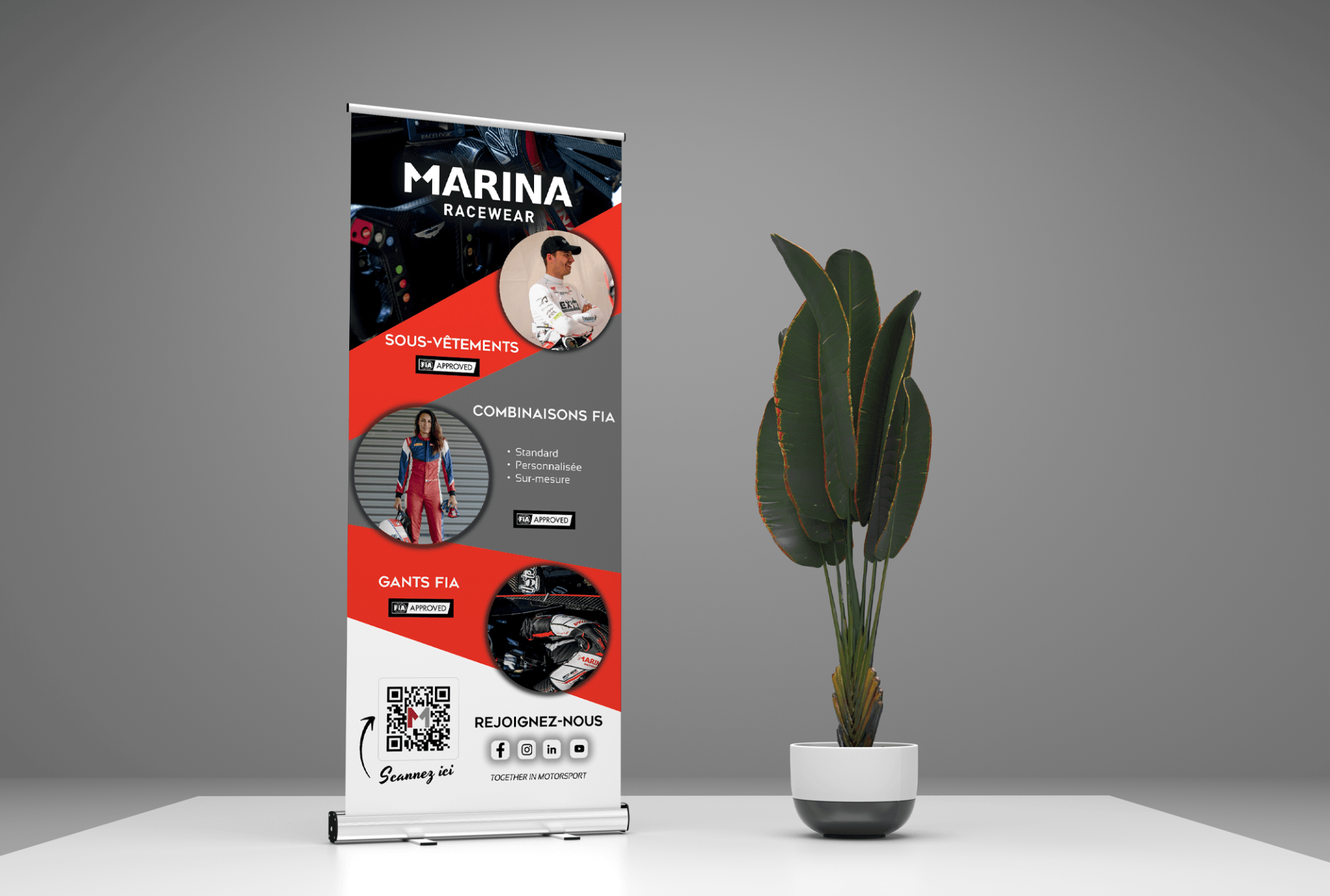 Pubkom réalise régulièrement des travaux d'imprimerie, comme ce roll'up, pour la marque Marina Racewear France dont les locaux sont basés dans le Parc d'activités de Signes. Le roll-up, aussi appelé kakemono, est un support de communication mobile, peu encombrant, facilement transportable et rapide à installer pour marquer sa présence sur les salons et les foires.