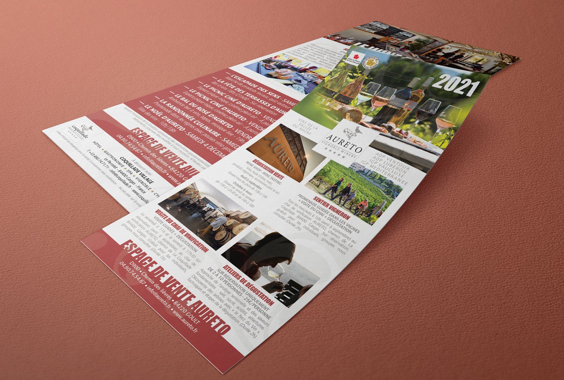 Depuis 10 ans, le vignoble Aureto fait confiance à Pubkom pour ses divers travaux de communication visuelle. C'est notamment le cas des flyers, imprimés sur papier recyclé, présentant les évènements annuels du domaine. Aureto est le vignoble de La Coquillade Village*****, luxueux complexe hôtelier Relais & Châteaux basé à Gargas (84). Visitez l'espace de vente à Goult (84) et découvrez les vins Aureto (AOP Ventoux, AOP Luberon, IGP Vaucluse, IGP Méditerranée) à travers des ateliers de dégustation.